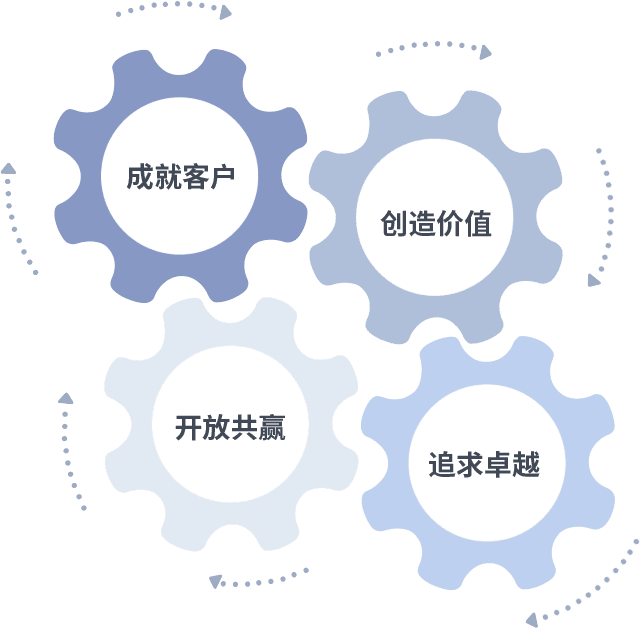 成就客户是一切决策的出发点,,创造价值是衡量所有工作的标准,,,,追求卓越是我们做事做人的态度,,开放共赢是我们的格局也是最终的结果。。。价值观的齿轮环环相扣,,,,推动着组织里的每个人不断向前。。